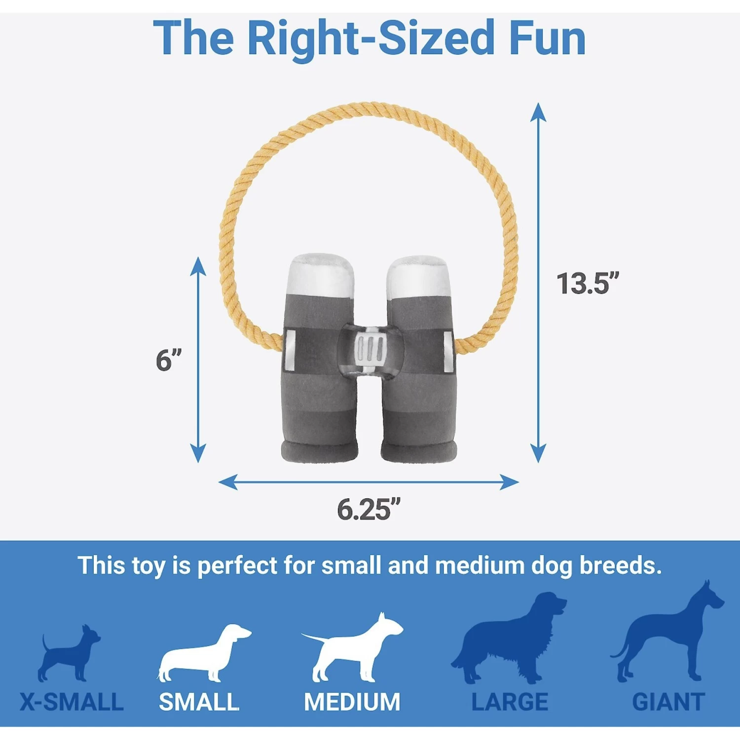 - Binoculars plush toy has squeakers and rope to focus in on the fun together.