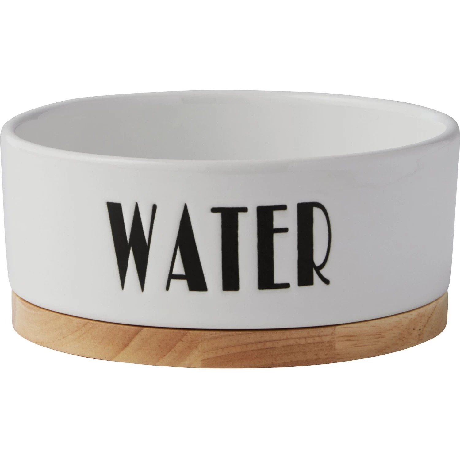 - Simple, white ceramic pet bowl with modern, black “water” graphic on the side.