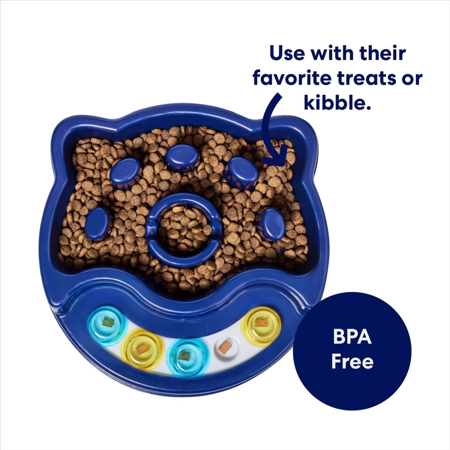 - This unique, two-in-one interactive puzzle features treat-hiding compartments and a large slow-feeder bowl to slow down your pup’s eating and promote better digestion.