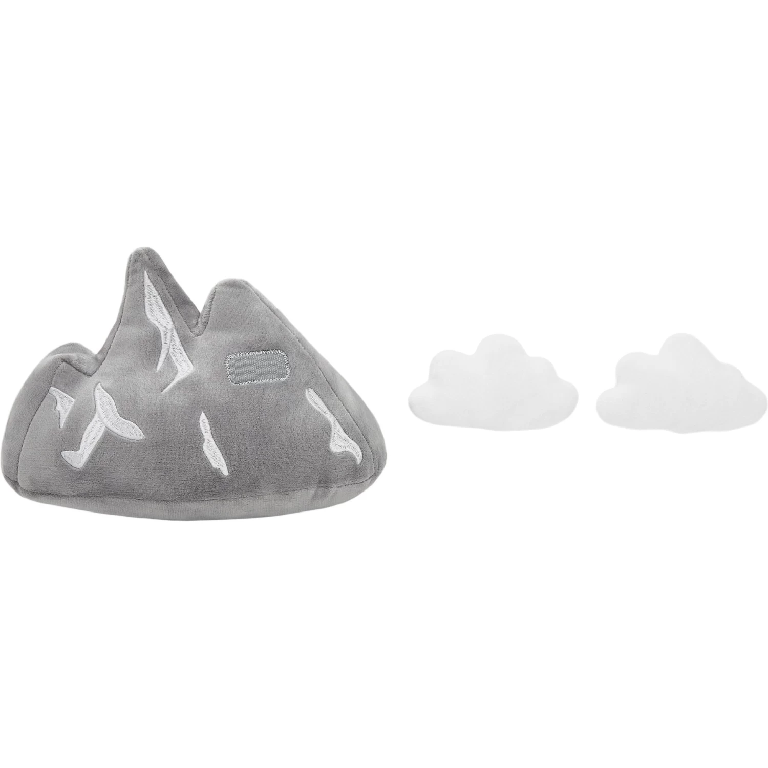 - Plush mountain features two removable clouds attached with hook and loop fasteners.