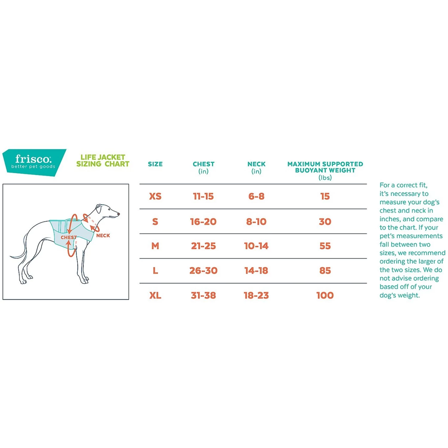- To find the right jacket for your pup, measure their chest, neck and weight. Then, compare their measurements to the size chart and the Maximum Buoyant Weight listed.