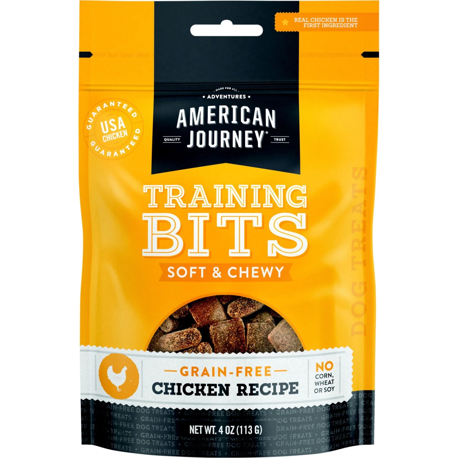 American Journey Chicken Recipe Grain-Free Soft & Chewy Training Bits Dog Treats, 4-oz bag — Reward your sidekick with a chewy, tasty treat that’s just the right size for training. American Journey Soft & Chewy Training Bits are moist, soft bites that are crafted with real chicken as the first ingredient for the taste dogs crave.