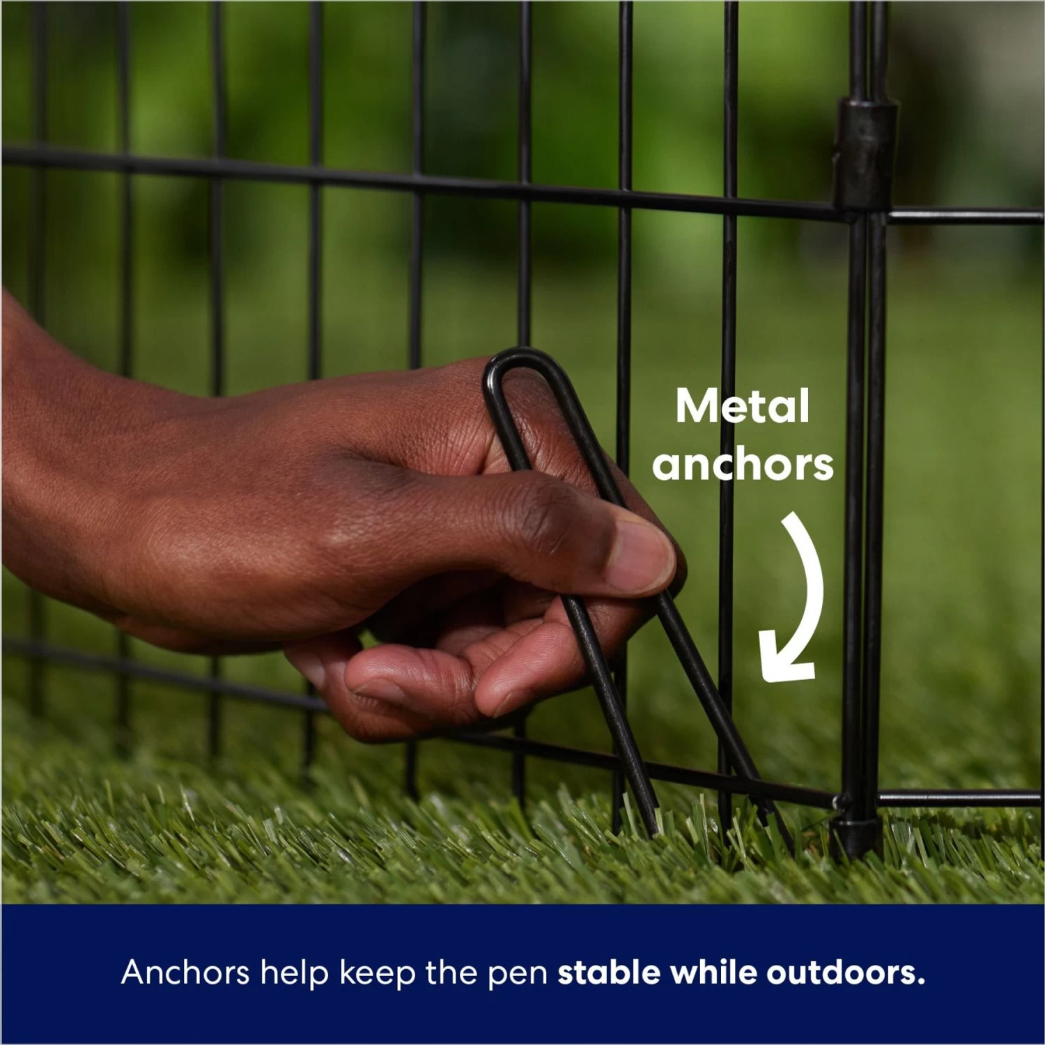 - Metal anchors are included to keep the pen in place outdoors, while the ability to configure the shape of the gate allows for it to fit an array of spaces.